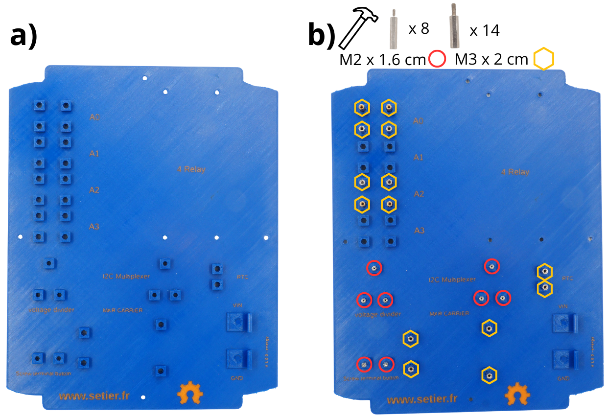 Retourner alors la plaque. Puis, à l’aide d’écrous M2 et M3, fixer les entretoises M2 et M3 précédemment insérer dans les différents trous.