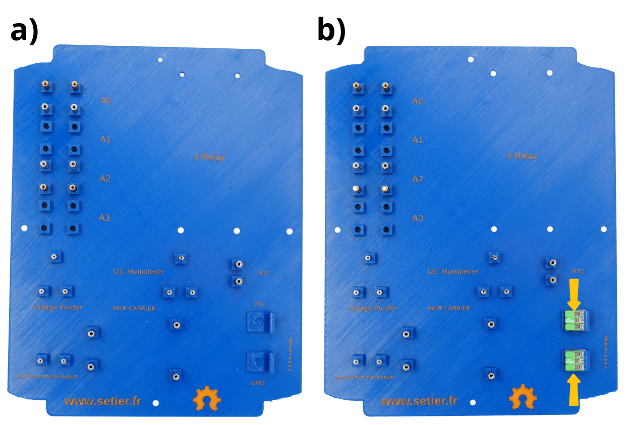 Placer les 2 modules de mesures sur les entretoises M3 prévu à cet effet (nommé sur la plaque A0, A1, A2 et A3, selon le nombre de capteurs qui seront branchés). Les visser à l’aide de vis M3