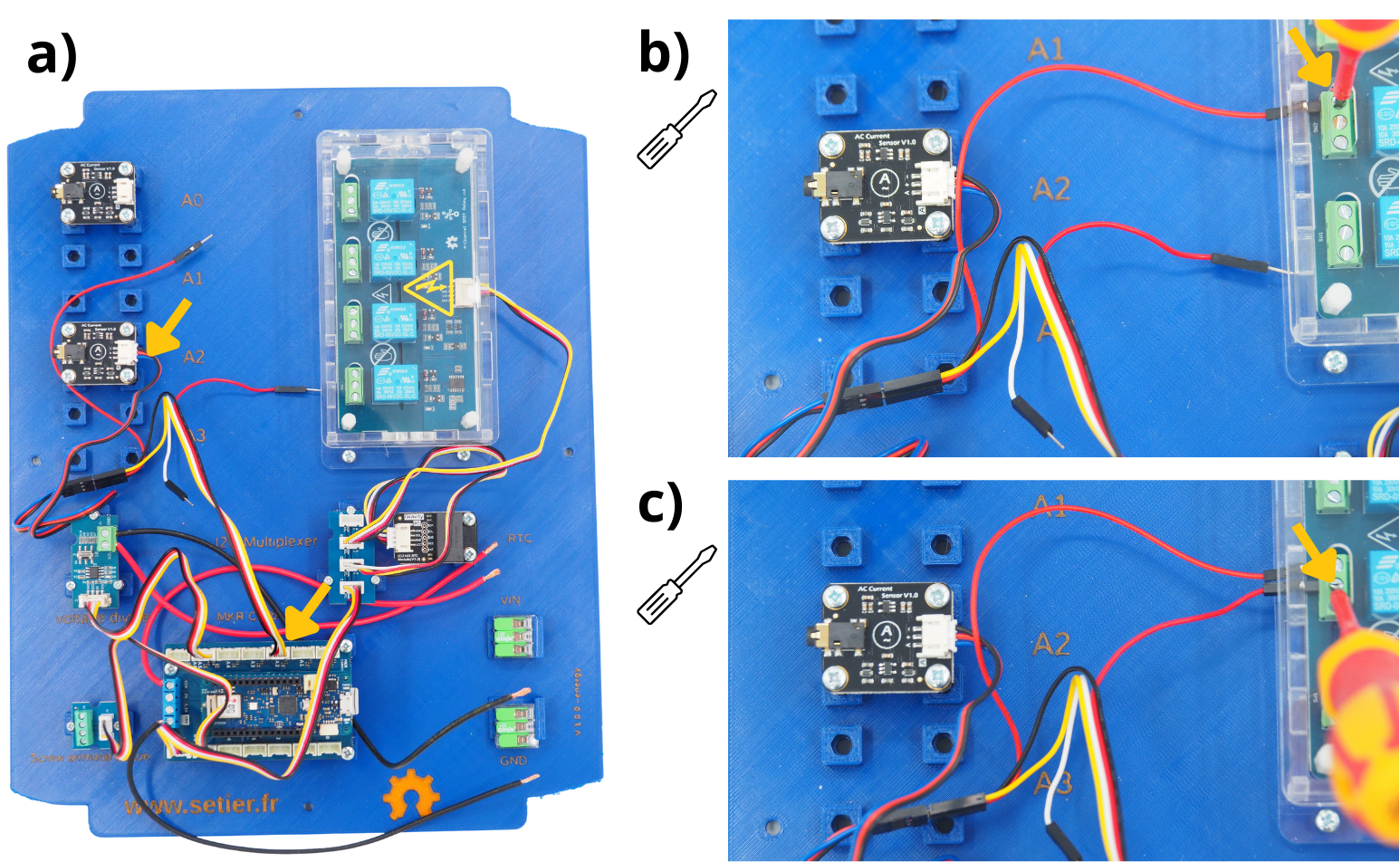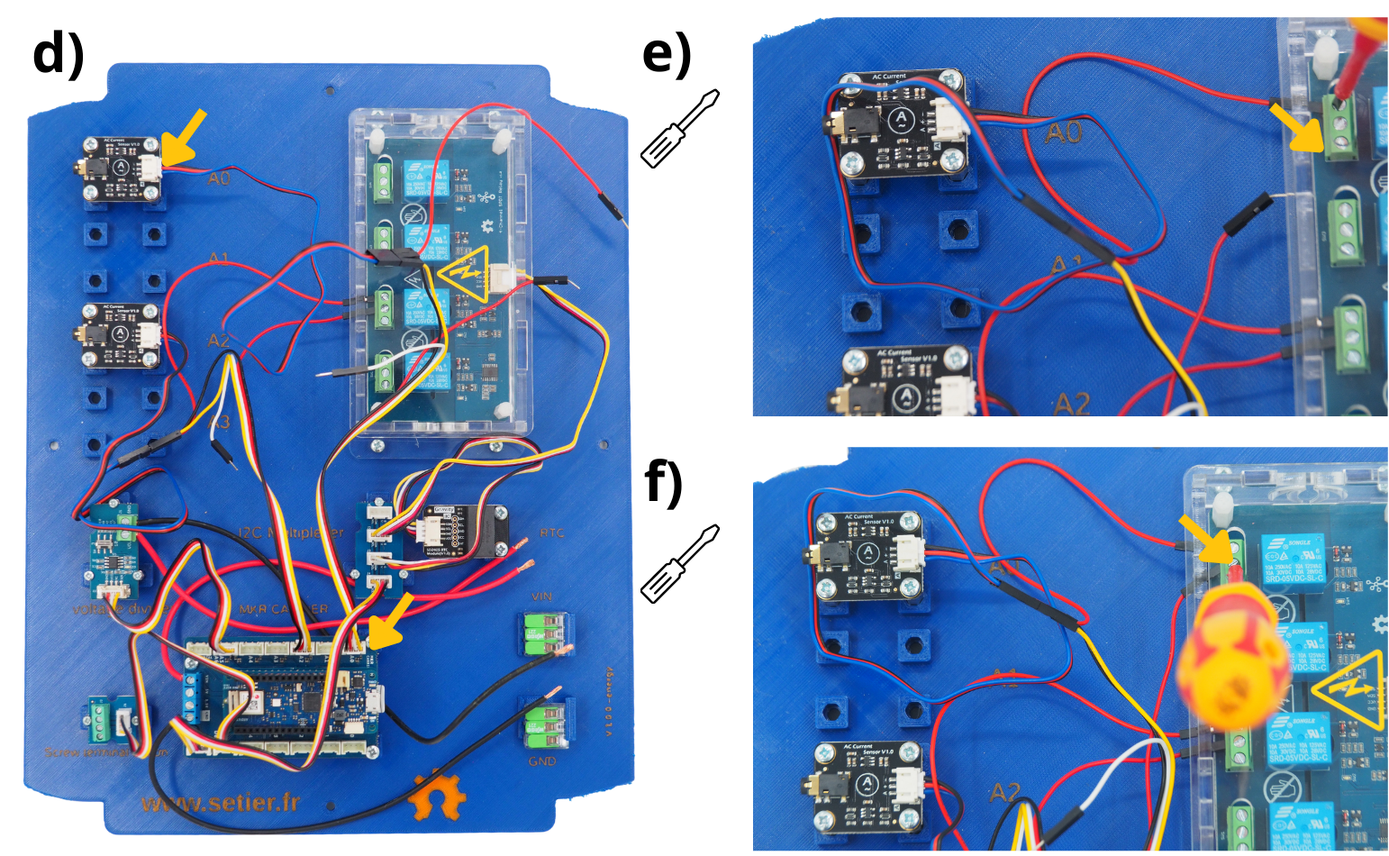 Pour les étapes qui suivent, il vous sera réguliérement demandé d’insérer des câbles dans différents borniers à vis, puis de les visser. Pour cela, il est d’abord nécessaire de dévisser le bornier à vis (voir image), afin de l”ouvrir, et permettre d’y insérer un câble avant de revisser pour fermer le bornier sur le câble.