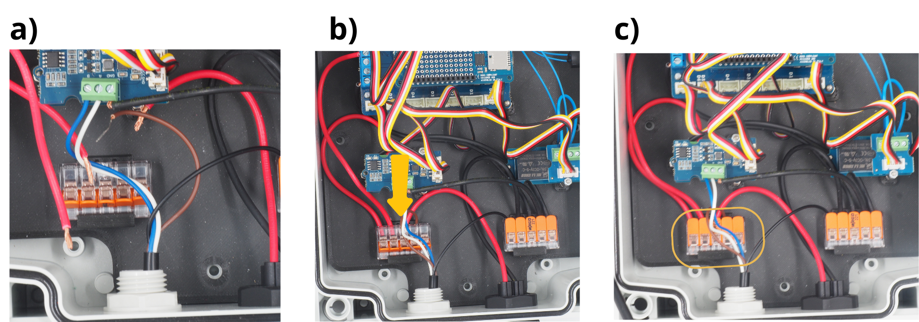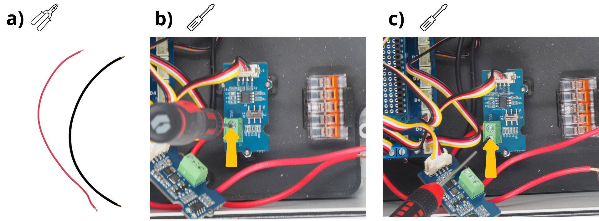 Pour les étapes qui suivent, il vous sera réguliérement demandé d’insérer des câbles dans différents borniers à vis, puis de les visser. Pour cela, il est d’abord nécessaire de dévisser le bornier à vis (voir image), afin de l”ouvrir, et permettre d’y insérer un câble avant de revisser pour fermer le bornier sur le câble.