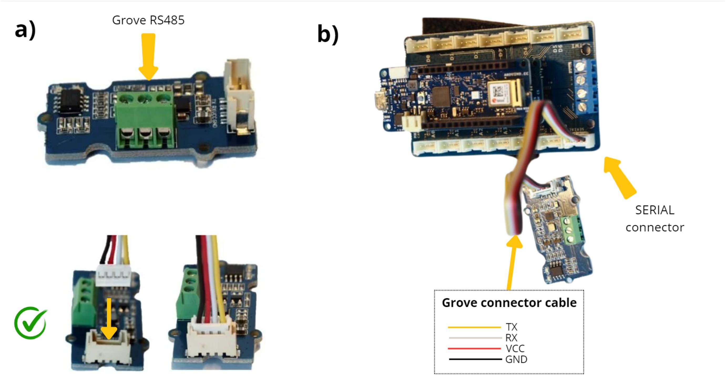 Brancher l’autre côté du câble de la carte module de communication RS485 vers le port «SERIAL» de la carte MKR CONNECTOR CARRIER.
