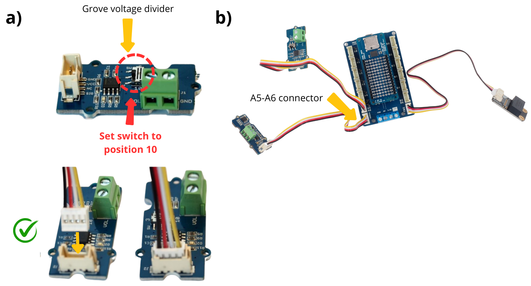 Tomar la placa divisor de tensión y conectar el cable Grove Connector suministrado. Cambiar el cursor de la posición inicial 3 a la posición 10.
