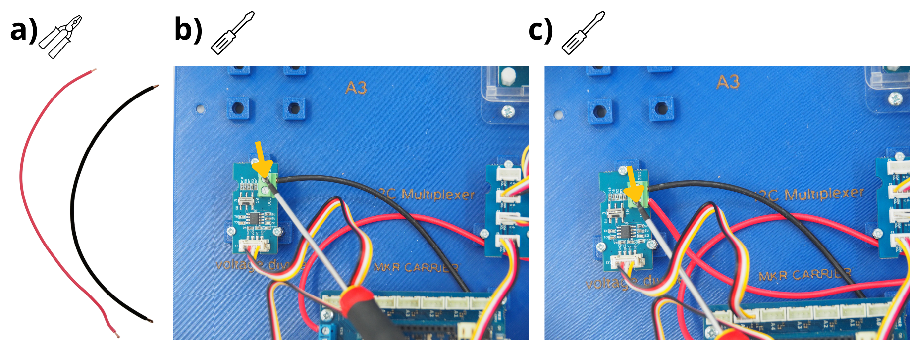 Insérer dans chacun de ces leviers l’extrémité restante des cables rouges suivant : en provenance du module Grove Diviseur de tension, en provenance du bloc d’alimentation et en provenance de la carte Arduino MKR CARRIER.