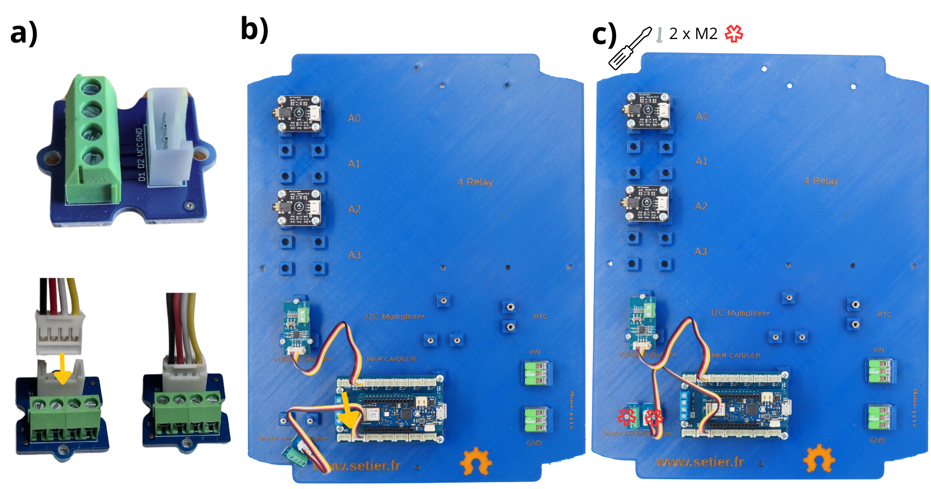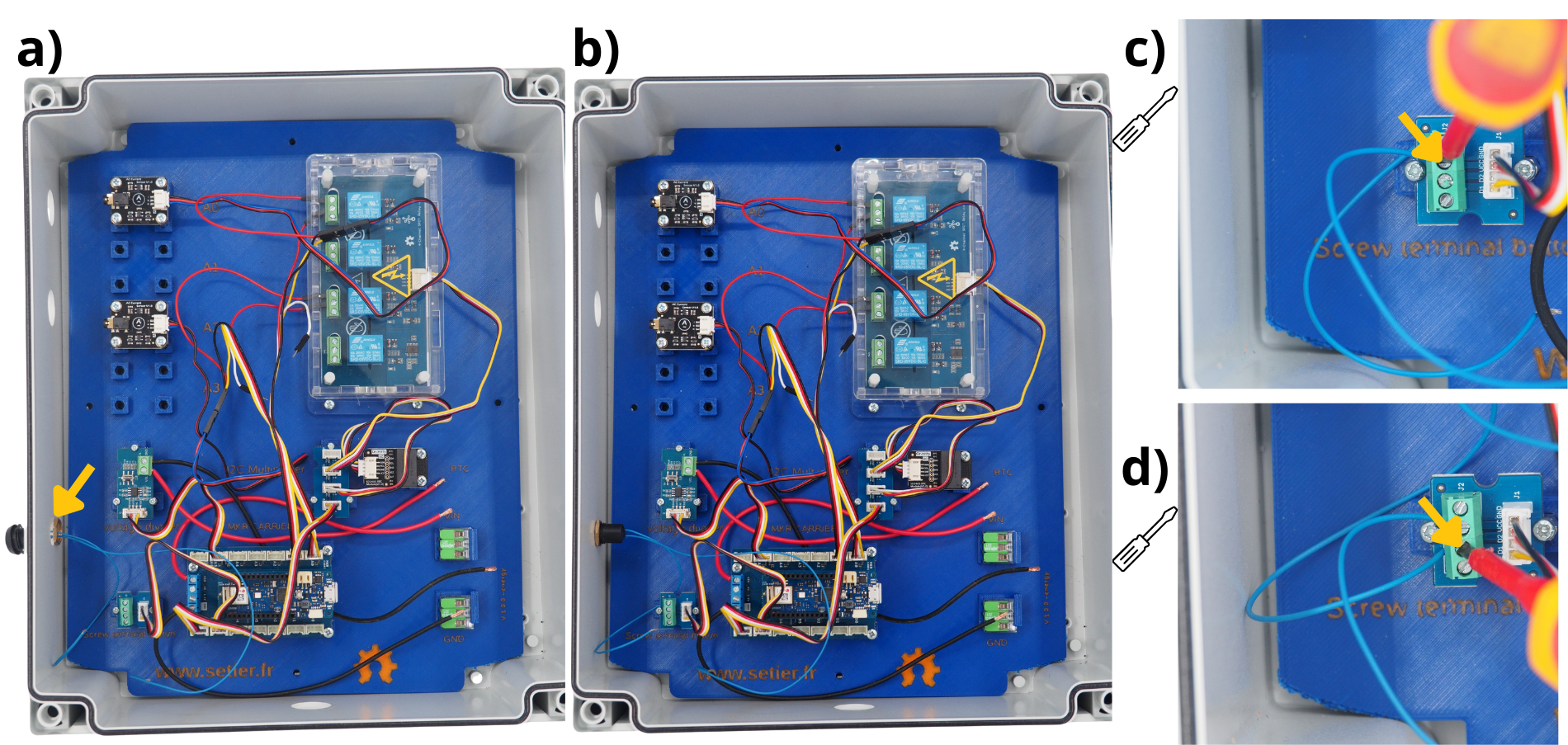 Pour les étapes qui suivent, il vous sera réguliérement demandé d’insérer des câbles dans différents borniers à vis, puis de les visser. Pour cela, il est d’abord nécessaire de dévisser le bornier à vis (voir image), afin de l”ouvrir, et permettre d’y insérer un câble avant de revisser pour fermer le bornier sur le câble.