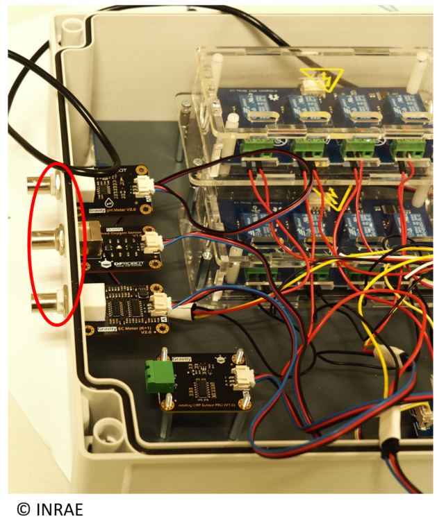Insérer les différents cables BNC des capteurs sur leurs cartes, en suivant cet ordre de haut en bas: pH, O2, Conductivité (trou de diamètre 12 mm).