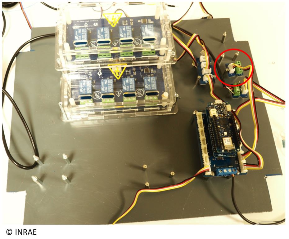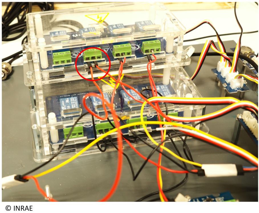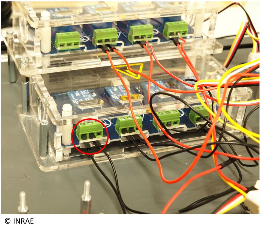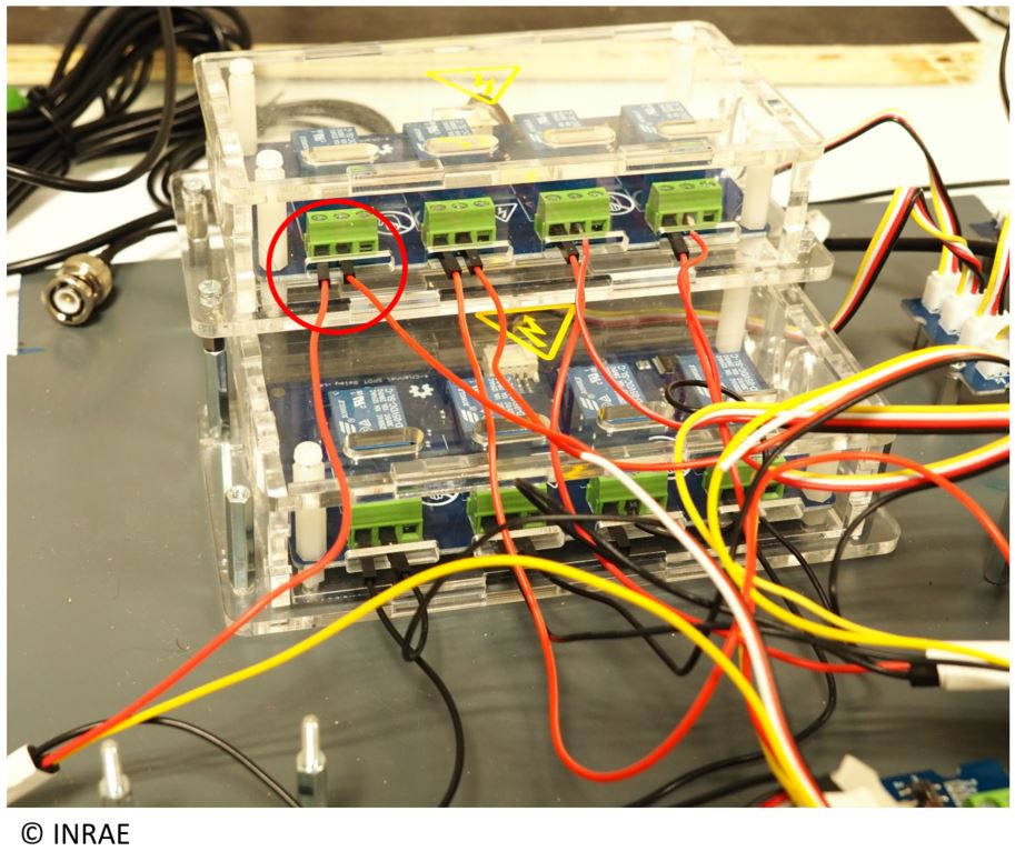 Connecter le cable noir provenant du capteur sur l’entrée gauche de la première carte relais, troisième relais. Ensuite, connecter le cable noir provenant du connecteur MKR carrier à l’entrée centrale de la première carte relais, troisième relais.