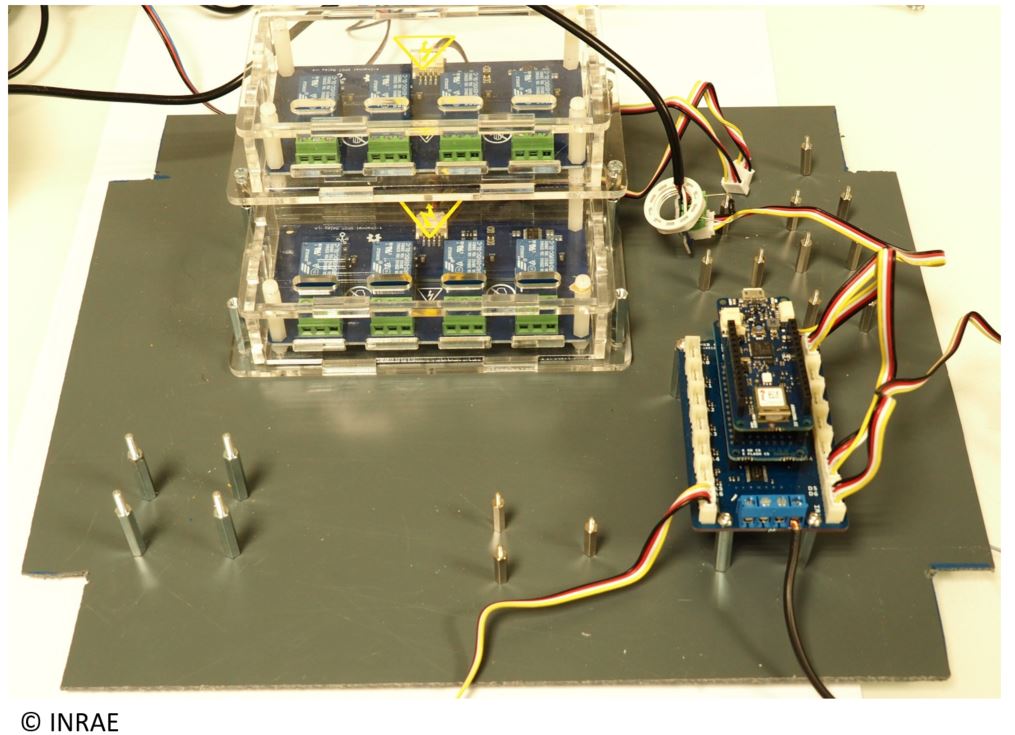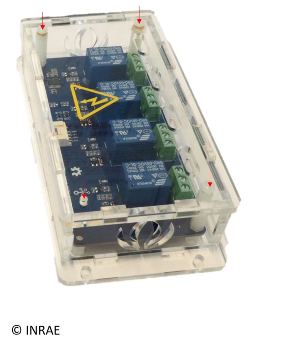 Fixer la premiere carte carte 4 relais avec des entroises M3 sur la partie arrière de celle-ci (« en suivant les indications du fichier physico_chemical_datalogger_hole.pdf »).