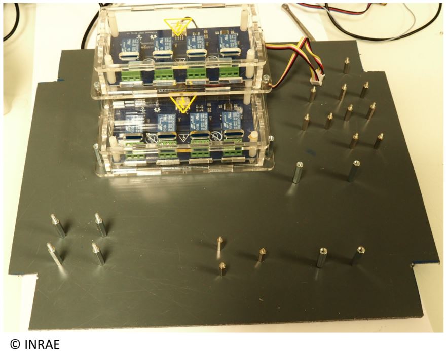 Fixer la seconde carte carte 4 relais sur les entroises M3 fixer à l’étape 7 (« en suivant les indications du fichier physico_chemical_datalogger_hole.pdf »). Pour la partie arrière, les fixer sur les entretoises déjà en place.
